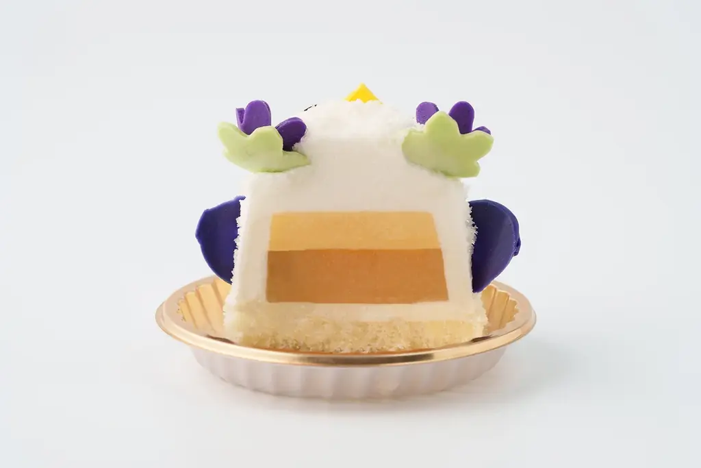 「横浜春節祭ぴよりん」は、名古屋コーチンの卵を使った濃厚なプリンと桃のジュレを、杏仁風味のババロアで包み、白いスポンジのクラムで覆ったぴよりんシリーズの特別仕様です。春節の装いを意識し、頭部には中華風のお団子ヘアをイメージしたチョコレートの花飾りがあしらわれています。