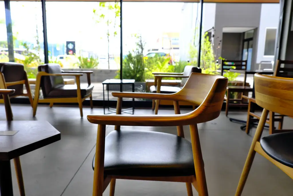 店内のテーマは「自然と森の隠れ家」。温かみのある木目調の内装に緑の植栽を配し、北九州らしさを意識した「鉄」のアクセントを加えることで、自然と人工が調和する独自の世界観を表現しています。ガラス越しの見通しがよく、通行者からの視認性も高い設計です。