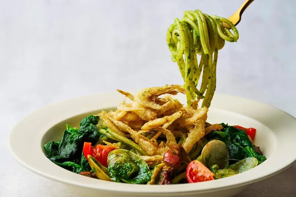 3月の第一弾に続き、4月1日からは次の限定メニューを販売予定です。4月のメニューは「ホタルイカとあさり、菜の花の鯛だし仕立て 白えびのフリット添え[パスタ]」で、ほろ苦い菜の花や旨み豊かな魚介、澄んだ鯛だしが特徴となっています。
