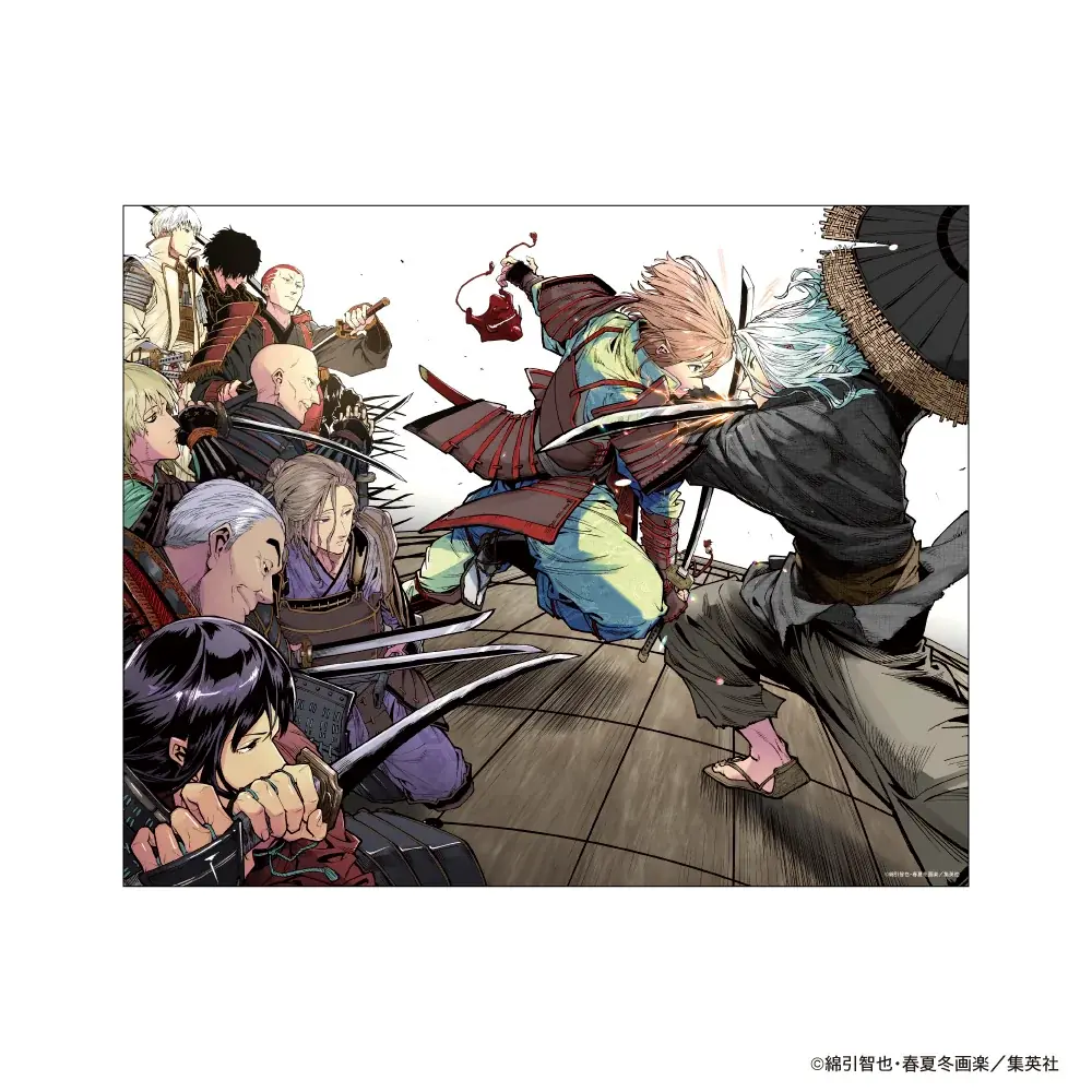 コミックの見開き1ページにあたるカラーイラストを、インテリア向けのキャンバスボードに仕立てた商品です。月山と対峙する名棋士たちを武士に例えた一枚で、部屋に飾ることで作品世界を常に感じられる仕様になっています。