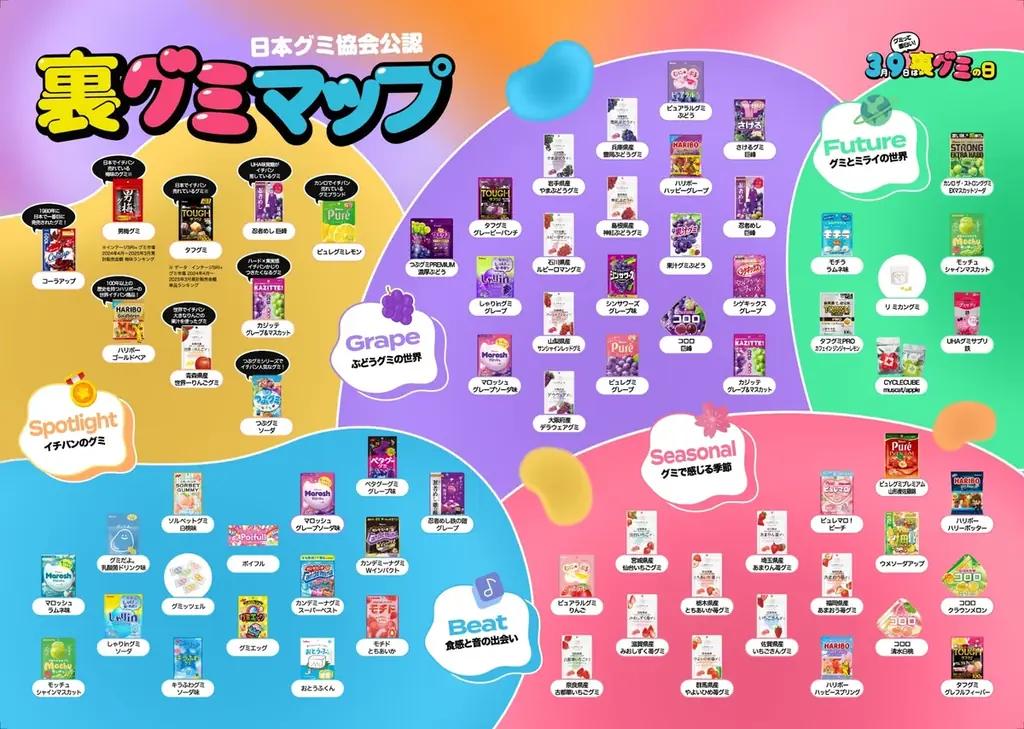 マップでは、ソフト・ハードという従来の分け方を超えた、グミの“裏側”がわかる5つの切り口で構成されています。主要メーカーの製品を網羅した横断型のマップで、ここでしか得られない情報が集約されています。