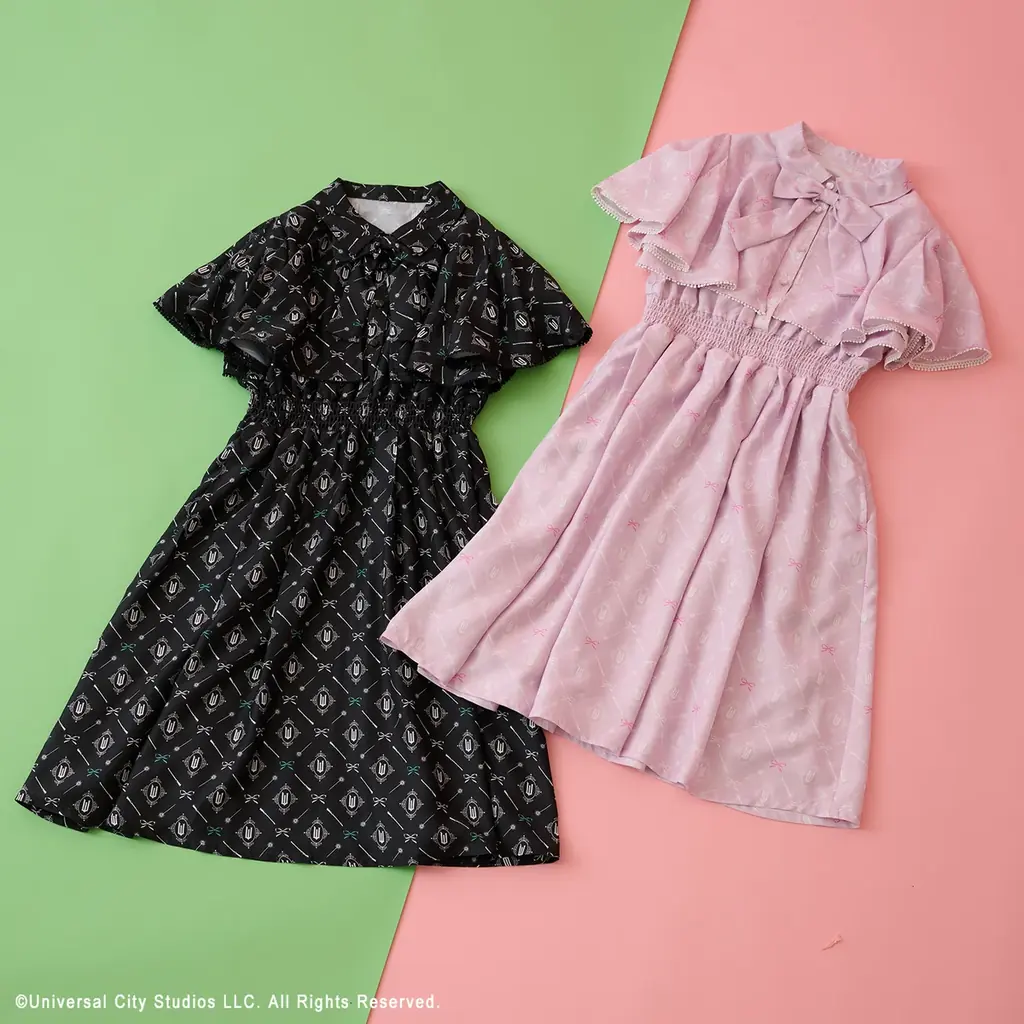 - 『ウィキッド』のオリジナル総柄を全体にあしらい、キャラクターイメージのカラーを配色。軽やかなブラウス素材をベースに、ケープを重ねたレイヤード感のある仕立てです。ふんわりとしたシルエットとリボンタイによる上品な印象が特徴です。