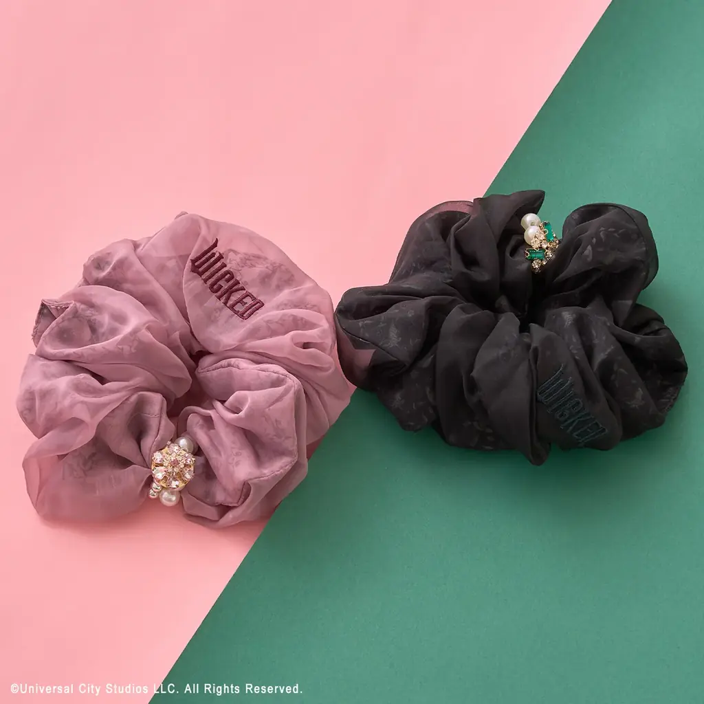 - 杖と箒のモチーフ柄にオーガンジー生地を重ね、ビジューやパール、ビーズで飾った華やかなシュシュ。ふたりのカラーをイメージした装飾が施されています。