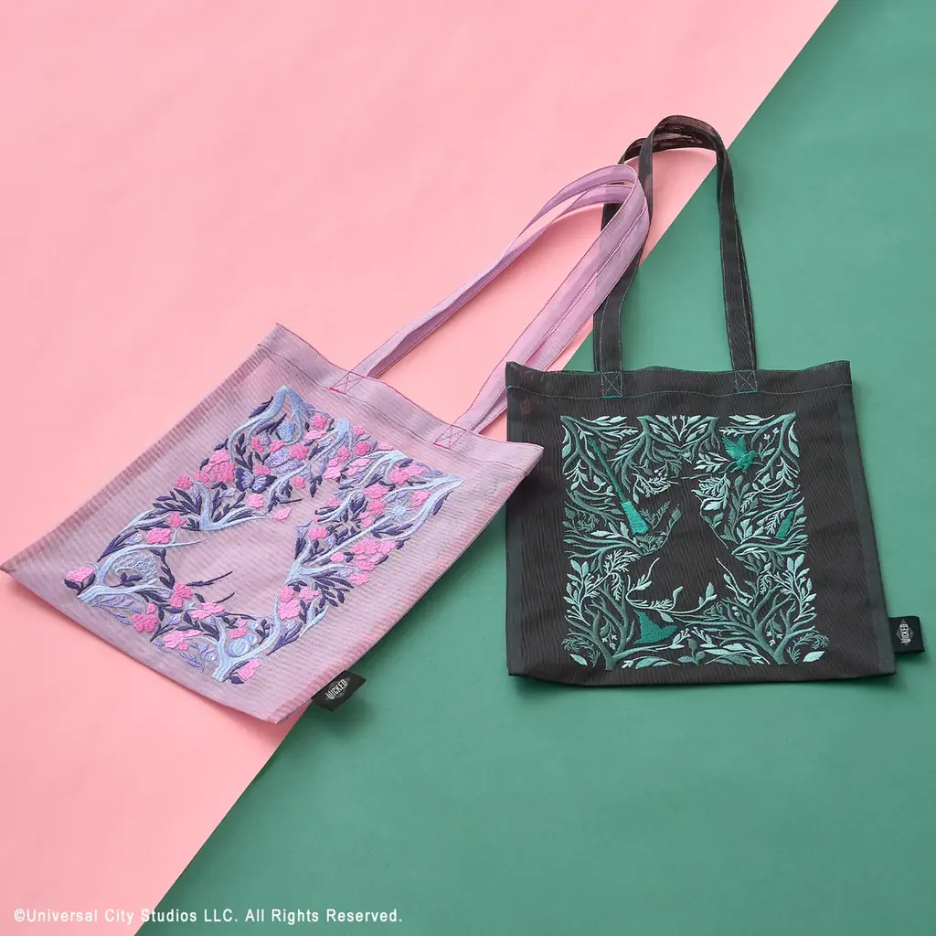 - 草花の中にエルファバとグリンダのシルエットが浮かび上がる繊細な刺しゅうとメッシュ素材の組合せ。ステッチやパイピングのカラーがアクセントになっています。