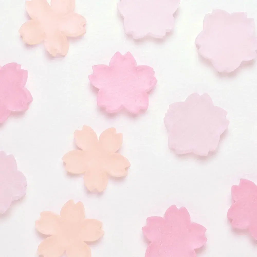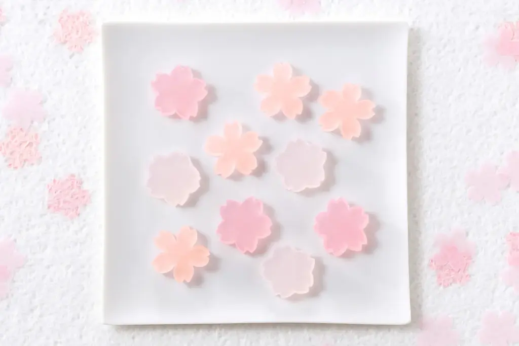 鶴屋吉信の桜琥珀糖は、寒天と砂糖を用いた伝統の「お干菓子」的製法により作られる琥珀糖です。外側が薄く糖化してしゃりっとした層を形成する一方で、内側はつるりとしたやわらかさを保ちます。使用する寒天は純国産です。
