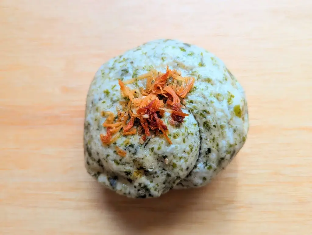- 「この度は数あるパンの中から選出いただき誠にありがとうございます。磯の香りのするあおさたっぷりの生地に、北海ホタテ貝柱フレーク入りふりかけとだしを混ぜ合わせた和風クリームチーズを巻き込んでつくっています。」