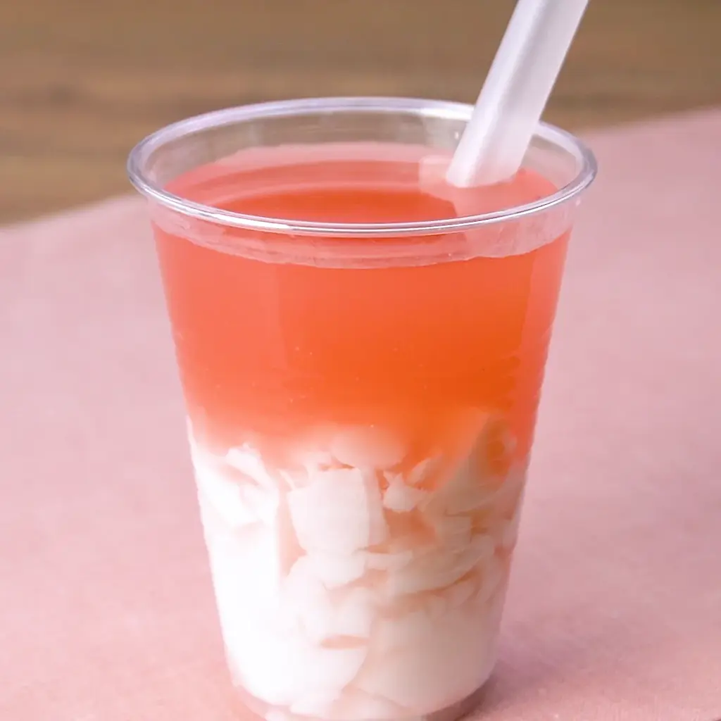 白いゼリーとピンク色のドリンクを二層にして注ぐことで、視覚的に春らしい演出をするドリンクです。ヨーグルトを粗めに砕くことがポイントで、細かくしすぎると混ざってしまうため、粗めの食感を残す必要があります。