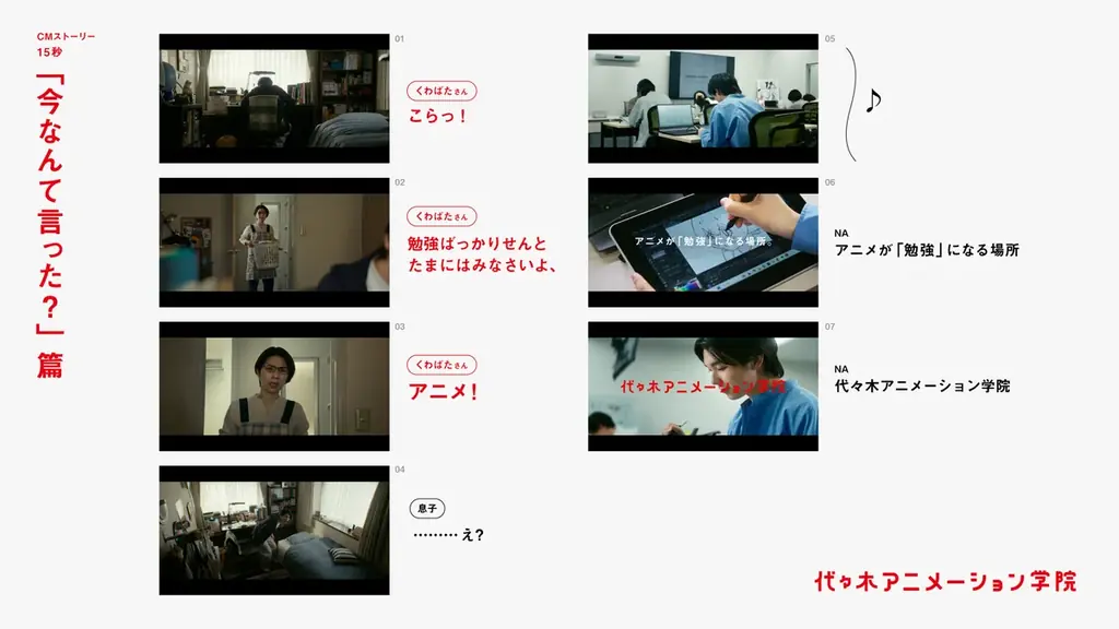 CMのクライマックスでは、息子の「待って、どういうこと!?」という問いに対して母が「だって行くんやろ?代々木アニメーション学院」と答えます。この台詞により、代々木アニメーション学院が掲げる「アニメが『勉強』になる場所」というメッセージが明確になります。