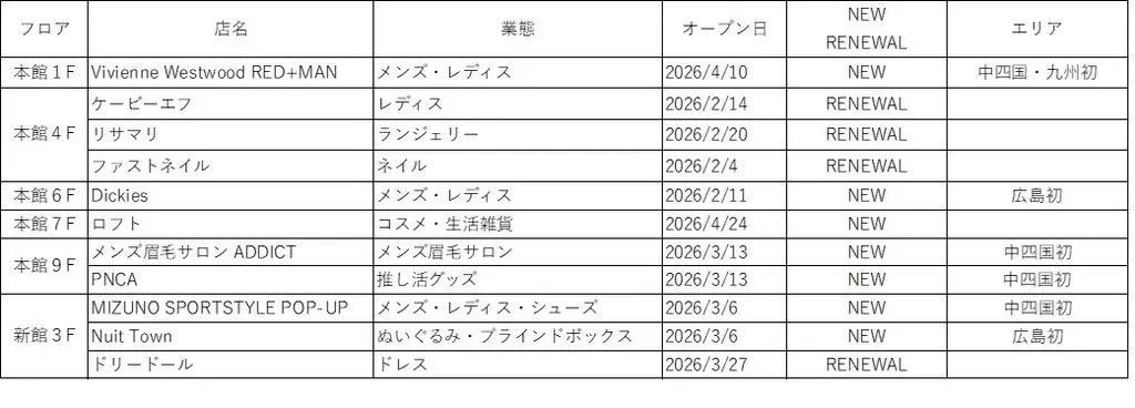| PNCA(推し活グッズ専門店) | 本館9F | 2026年3月13日(金) | 推し活グッズ(ネームタグ、トレカホルダー、ペンライトカバー、公式買取トレカ 等) | 中四国初(常設店) |