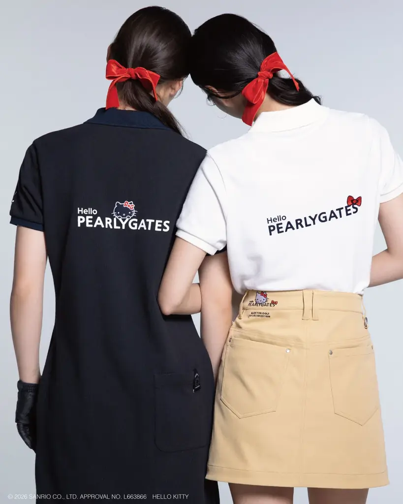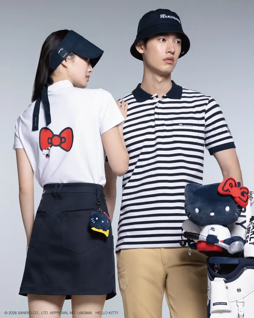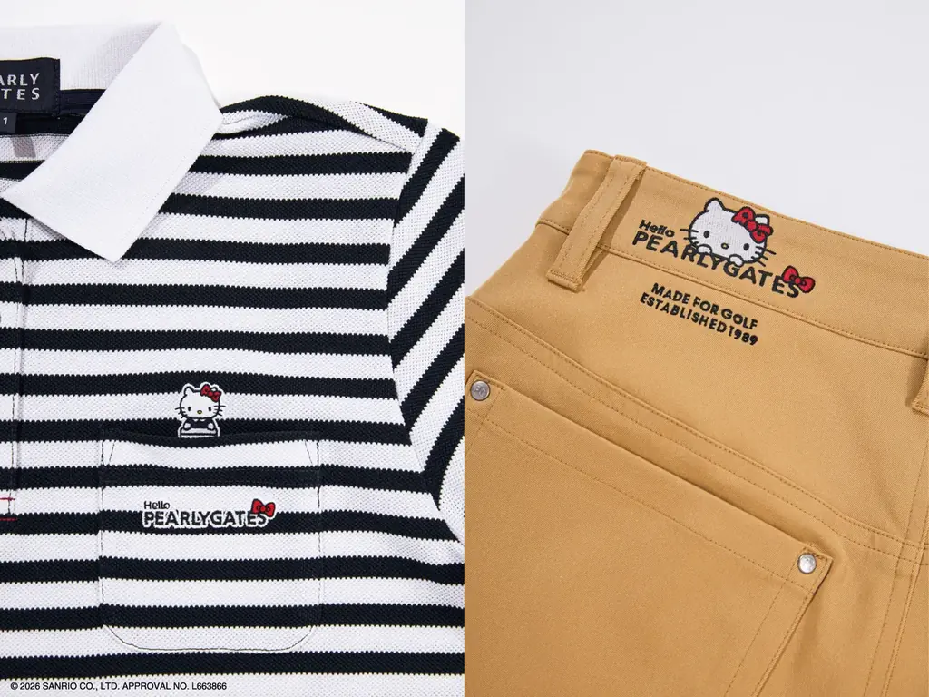 コレクションのテーマは『PEARLY GATESといつでも一緒 ハローキティ』。ブランドを象徴するネイビーカラーにトラッドのトリコロールカラーを重ね、ゴルフのプレー時だけでなく日常でも使えるデザインを目指しています。ハローキティのモチーフはクラブやボールを持った姿でさりげなく配され、赤いリボンをよく見ると「P」と「G」を表すなど、細部に遊び心が込められています。
