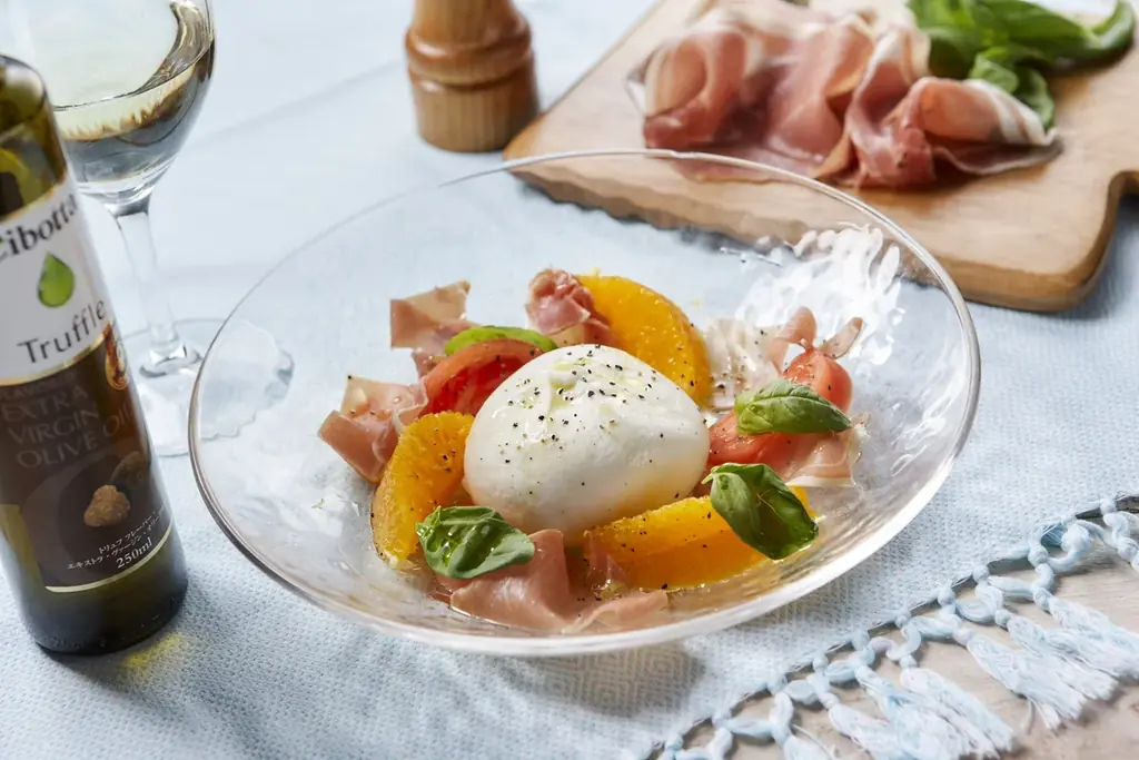 使用するのはプーリア州産のブッラータ。とろけるような白いチーズに色鮮やかなフルーツと生ハムを合わせ、仕上げにイタリア産トリュフオイルを振って海辺のリゾートを想起させる一皿に仕立てています。