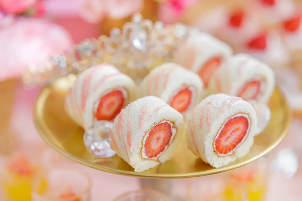 - あまおういちごのロールケーキ~真珠の首飾り仕立て~:あまおうを使用したロールケーキを真珠の首飾りに見立てた装飾。