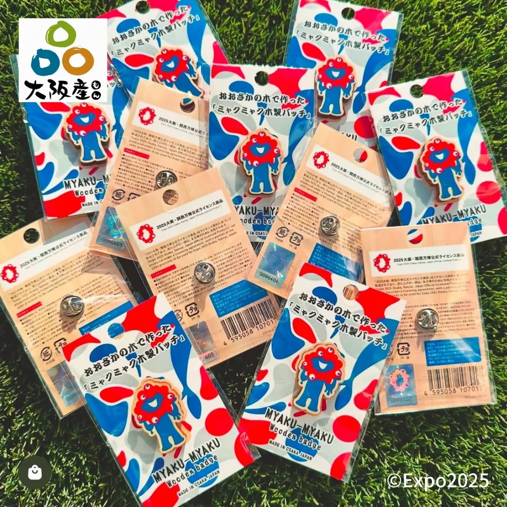 また、従来品の「ミャクミャク木製バッチ」は一度完売していましたが、反響を受けて数量限定で再販が行われます。再販品も同じく大阪府産ひのきを使用した日本製です。