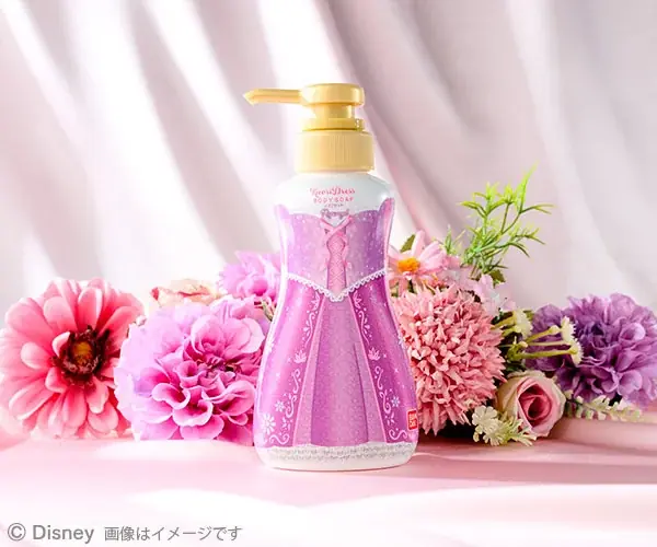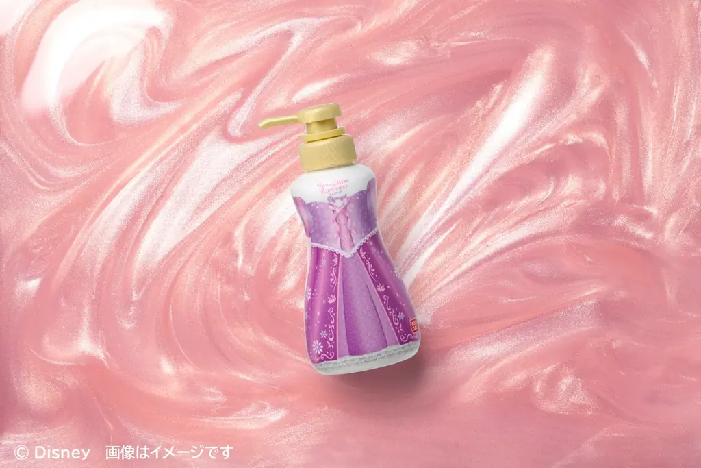 ラプンツェルのボトルはドレスを模したデザインで、フラワーパフュームの香りを詰めたラメ入りピンク色のボディソープです。香りは華やかさを意識した調香で、優雅なバスタイムに寄与することを意図しています。