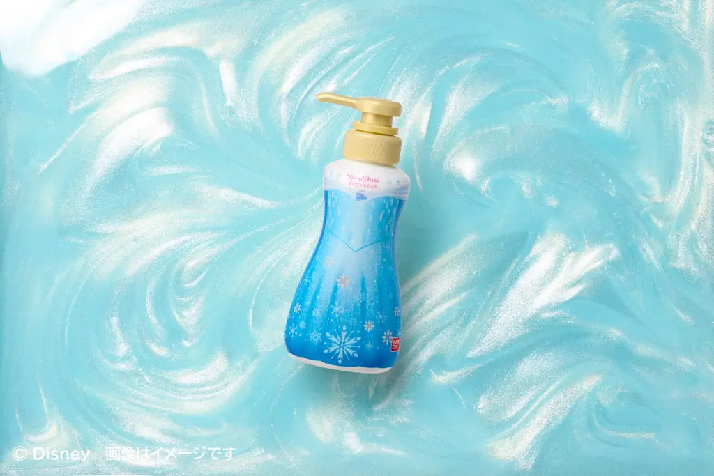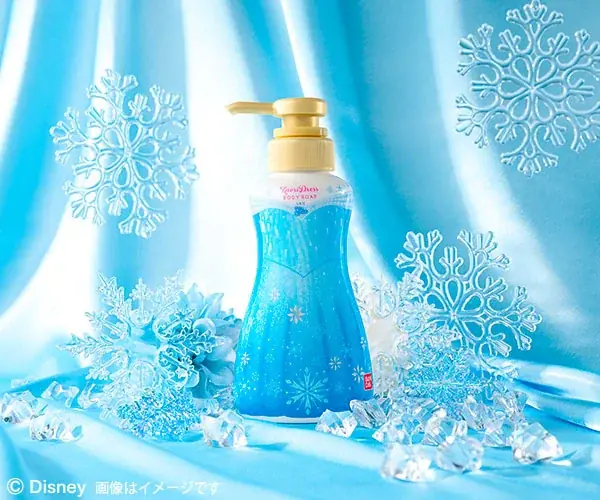 エルサのボトルは氷や雪を思わせるドレスイメージで、スノーパフュームのさわやかな香りを詰めたラメ入り水色のボディソープです。さわやかな香り設計により、リラックス感や爽快感を得やすくする狙いがあります。