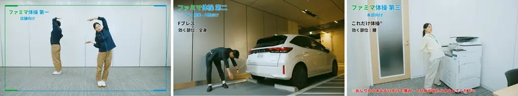 | ファミマ体操の特徴 | 松平 浩先生(元東大病院特任教授)とWell Body株式会社の監修。職種別(店舗編・SV編・スタッフ編)、独自楽曲・Fポーズ導入、10秒で完結 |