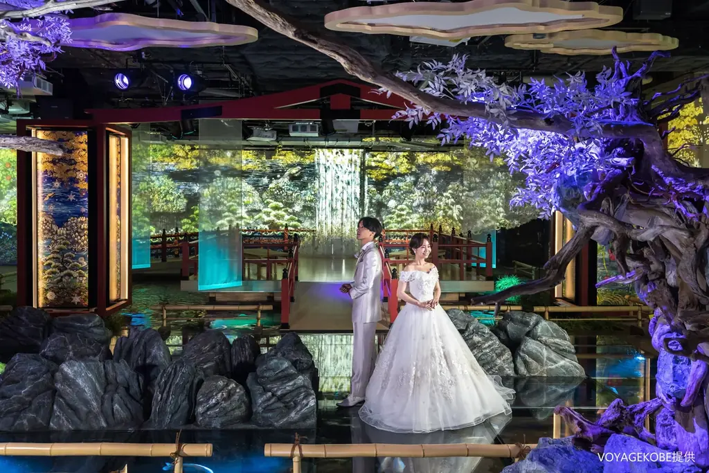 プランに含まれるアトアでの撮影は、たとえば無数の星に包まれる惑星をイメージした“PLANETS”や、光の切り絵を投影して和の空間を演出する“MIYABI”など、写真にドラマ性を与える演出が可能な点が魅力です。ただし、アトアの企画展やイベントの状況によっては希望のゾーンでの撮影ができない場合があります。