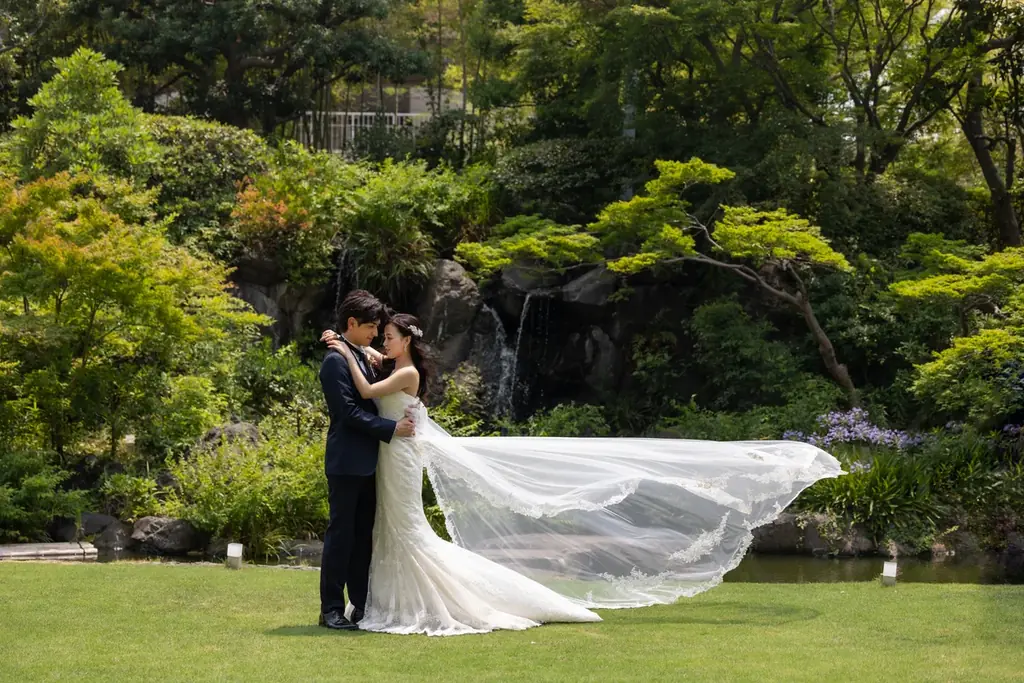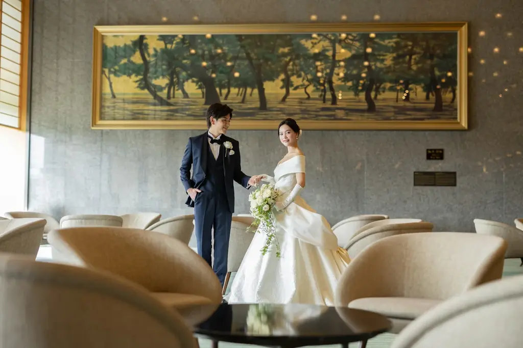 フォトウエディングでは、チャペル、ルーフガーデン、メインロビー、日本庭園、正面玄関、大階段の中から2カ所を選んで撮影が可能です。特に約600坪の日本庭園やメインロビーの日本的な設えは、和装や洋装のどちらにも映える背景となります。
