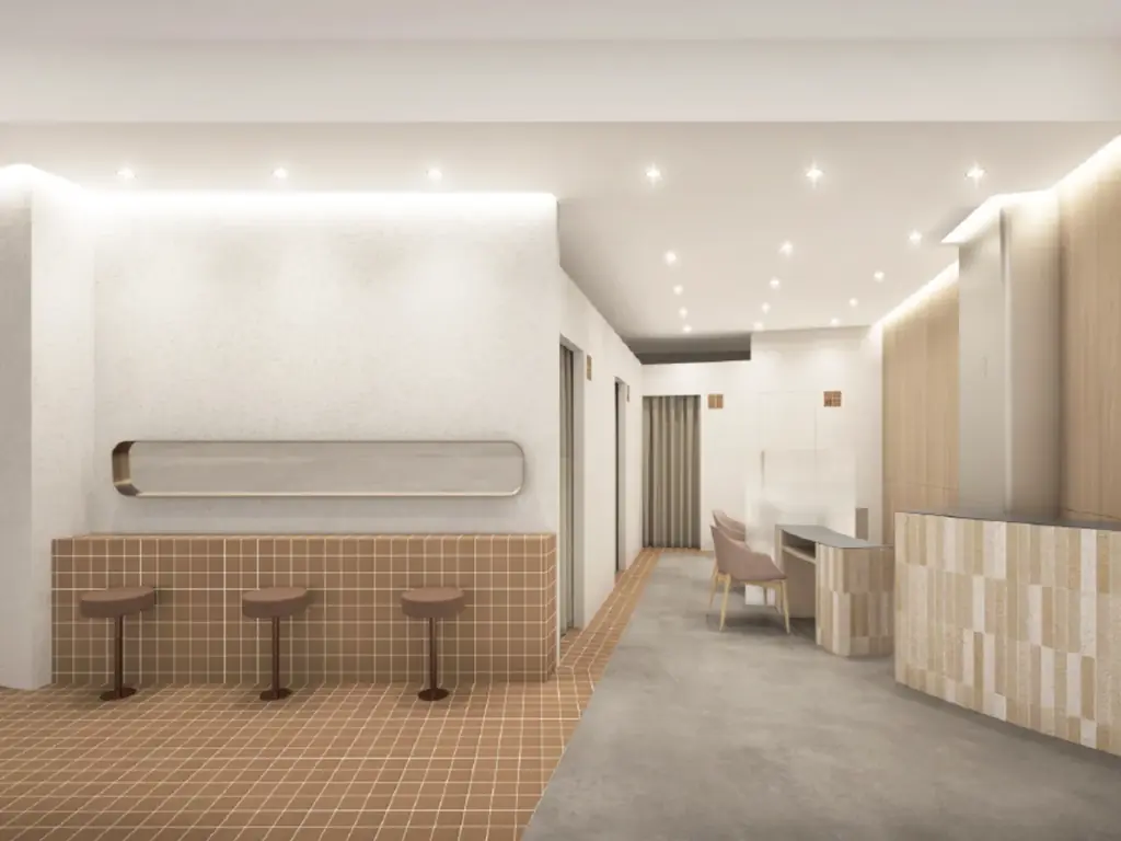 大井町トラックスという施設の性格を踏まえ、アンジェリカミッェル 大井町トラックス店は「街にひらかれた心地よい空間」をコンセプトに設計されています。店内はホワイトベージュとオレンジブラウンのタイルを基調とし、素材感のある壁やステンレスをアクセントにした温かみのある内装が特徴です。