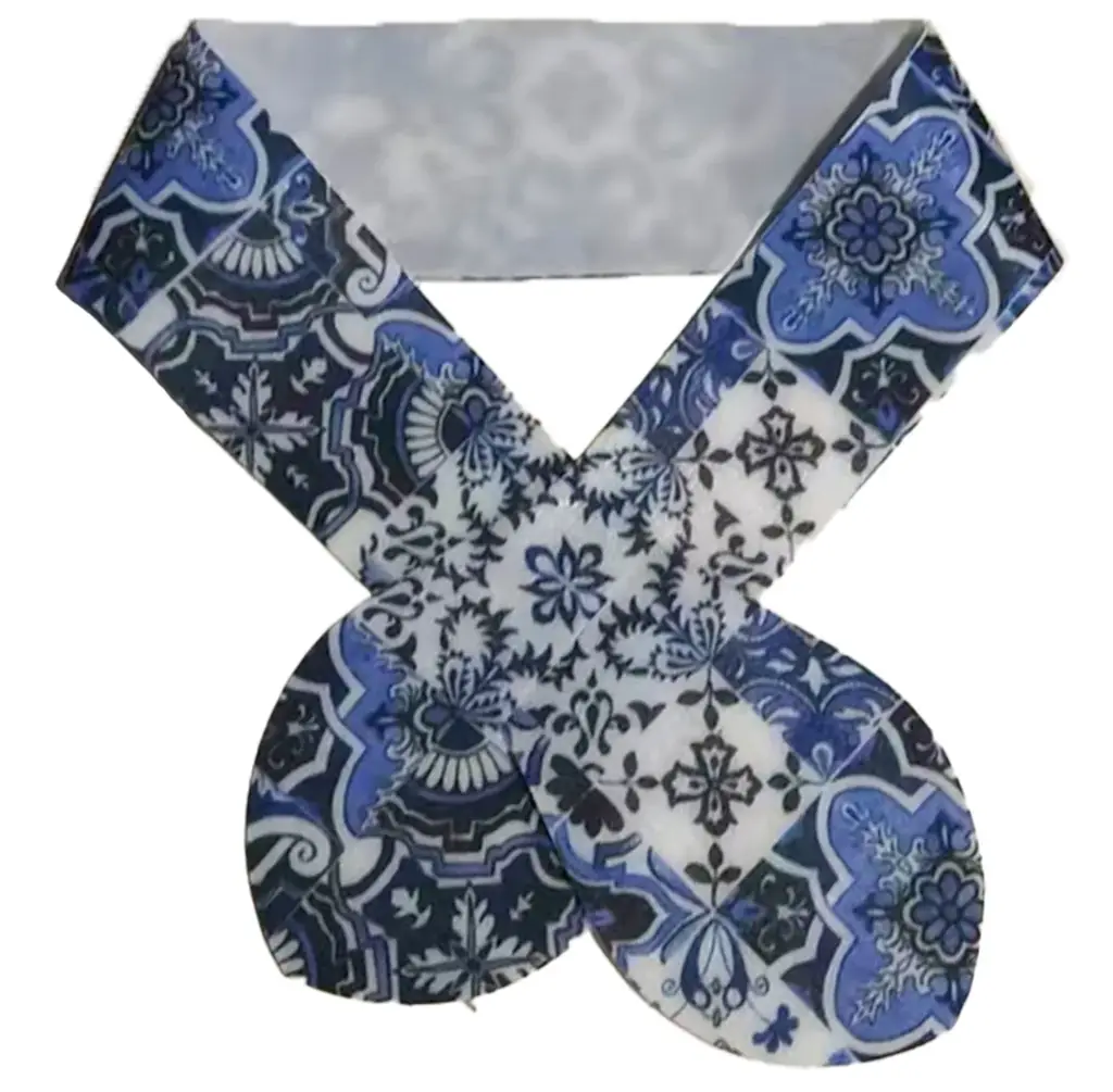 雪空ストールはスカーフのように首に巻いて使えるデザイン性の高い製品です。モロッコタイル風のパターンを採用し、見た目にも涼しさを演出します。香り付きのラインナップで、ファッション性やギフト性を重視した展開です。