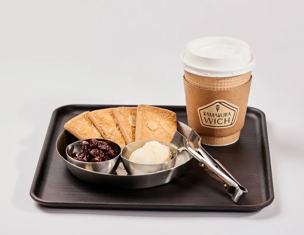 - ハンドメイドセット:800円(税込) — 鎌倉ビスケとバタークリーム、自家製ラムレーズンを自分で挟んで楽しむセット。ドリンク(コーヒーまたは紅茶)付き。+50円でラムレーズン増量可。