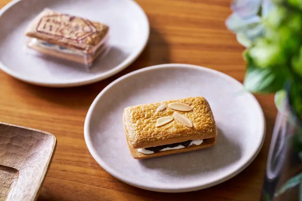 商品の製造工程は手作業を重んじ、卵塗りやアーモンドをのせる作業は一枚一枚人の手で行われます。長年の経験を持つスタッフが、まるで熟練の職人のようにレーズンをサンドする工程を担当し、機械はあくまで補助的な役割です。こうした手作りの温もりが商品の個性につながっています。