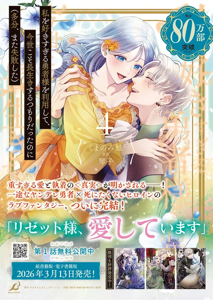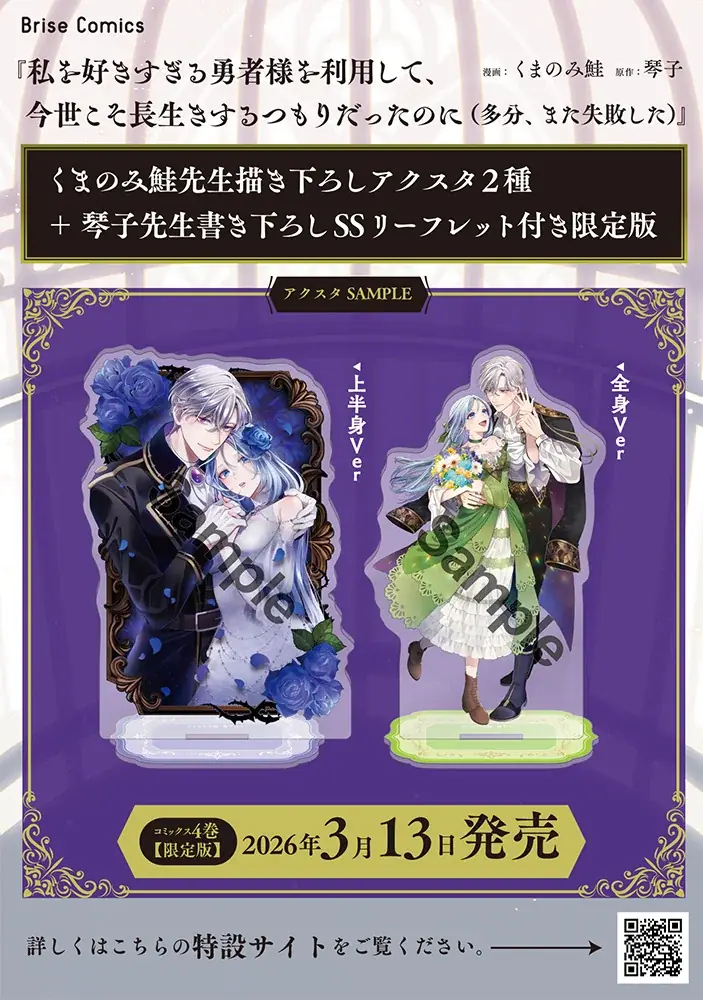 株式会社キルタイムコミュニケーションは、ブリーゼコミックスより『私を好きすぎる勇者様を利用して、今世こそ長生きするつもりだったのに(多分、また失敗した)4』および紙書籍限定の『私を好きすぎる勇者様を利用して、今世こそ長生きするつもりだったのに(多分、また失敗した)4 アクリルスタンド2種+SSリーフレット付き限定版』を、2026年3月13日に同時発売すると発表した。プレスリリースは2026年3月11日07時10分に公開されている。
