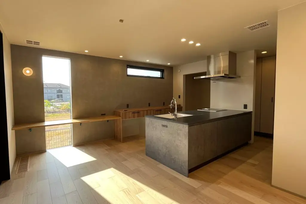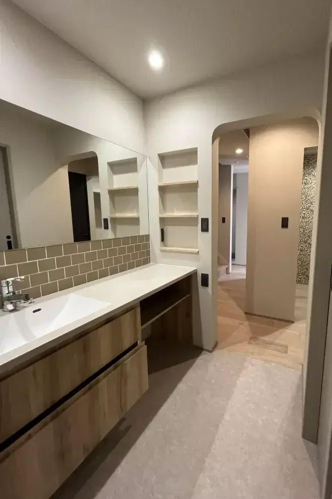 このオーナー宅は、和の素材感と北欧のミニマルな美意識を掛け合わせた「ジャパンディ」スタイルで設計されています。木や塗り壁といった自然素材の温もりを活かしながら、ベージュやグレージュのニュアンスカラーで統一された内装は、落ち着きと洗練を両立させます。