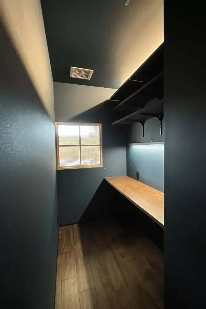 書斎には室内窓を採用し、個室としての静けさを確保しつつ、リビングにいる家族の気配を感じられる設計としています。集中が必要な作業と家族のコミュニケーションの両立を図る間取りです。