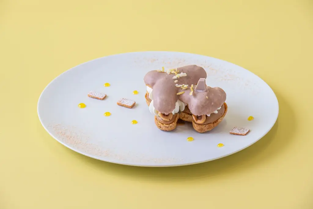 構成はノワゼットプラリネのカスタードとレモンクリーム、さらにノワゼットのキャラメリゼをサンドしたもので、香ばしいヘーゼルナッツ(ノワゼット)のコクとレモンの爽やかな酸味がバランスよく組み合わさります。甘さと酸味のコントラストがこの一品の狙いです。