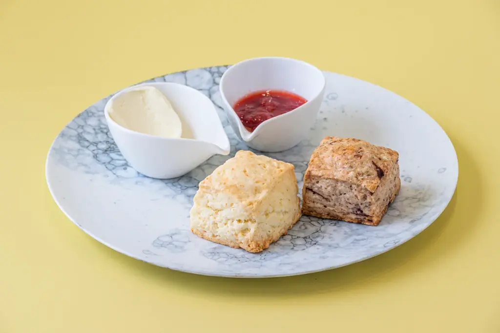 スコーンは温かく提供され、他のスイーツやドリンクと組み合わせて味の幅を楽しめるよう設計されています。
