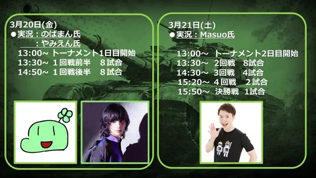 | 実況・司会 | 3/20:のばまん氏・やみえん氏、3/21:Masuo氏(決勝担当) |