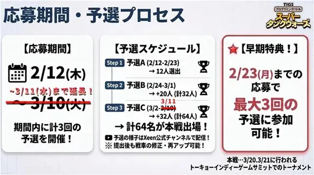 本戦進出枠は64名で、予選は応募期間中に3回実施されます。決勝および会場イベントは2026年3月20日(金)・21日(土)に開催予定です。