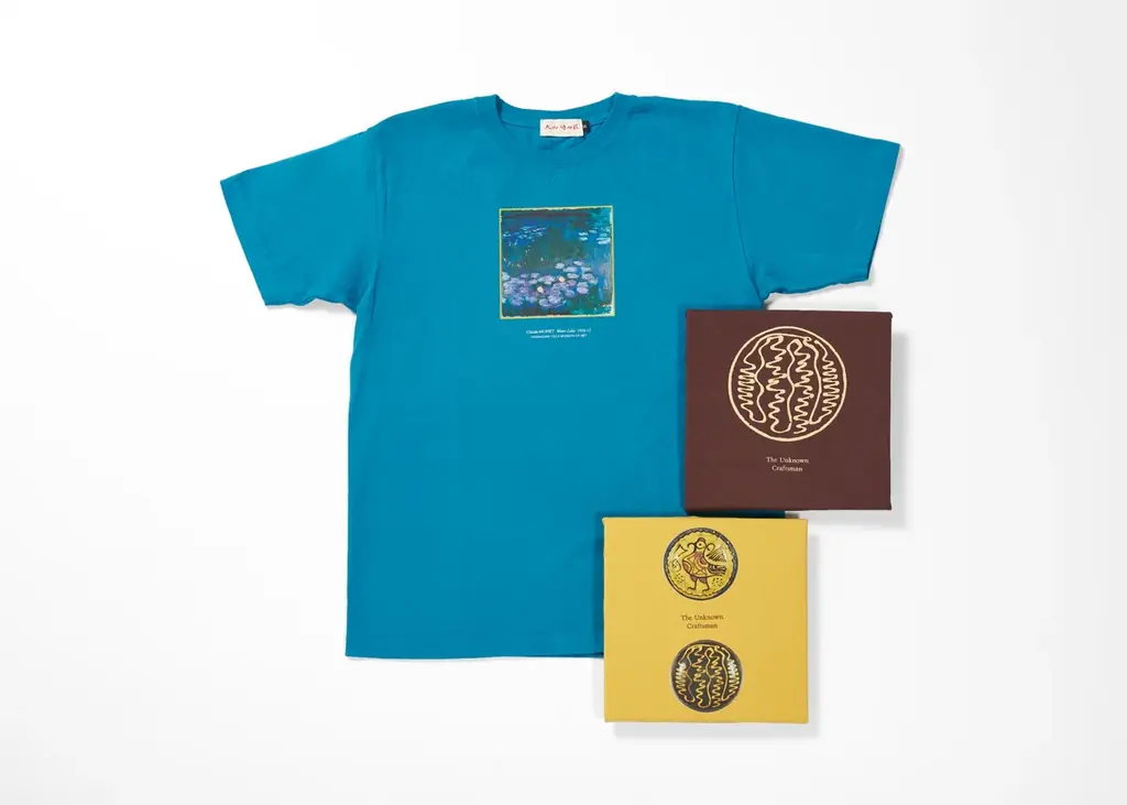 - 製品染めTシャツ:作品から抽出した色で染めたTシャツ、胸元にモネや民藝作品のモチーフ。