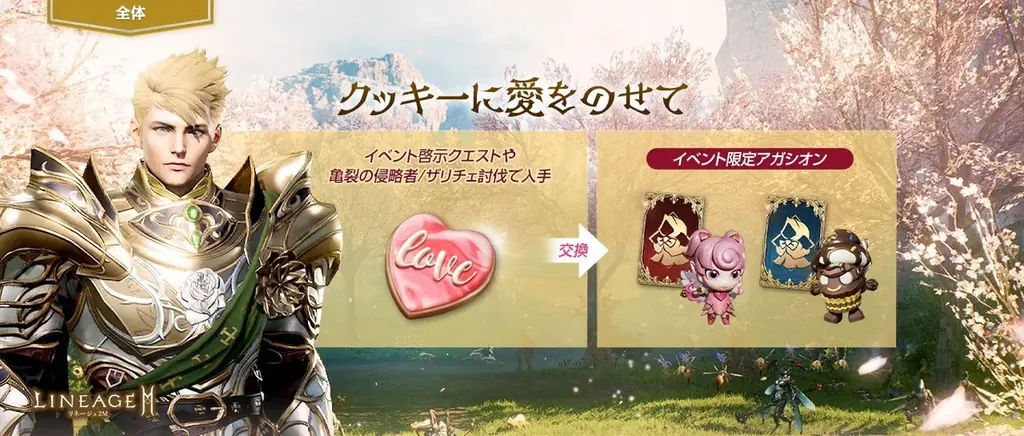 「愛のホワイトデー クッキー(イベント)」は、毎日アデナで交換できる啓示書「パティシエの頼み(イベント)」の達成報酬、期間限定の亀裂の侵略者「チョコ ソルジャー」の討伐、ザリチェやアカマナフ出現のボス討伐などで獲得可能です。あわせて専用シーズンパス「クッキーは愛をのせて」も登場します。