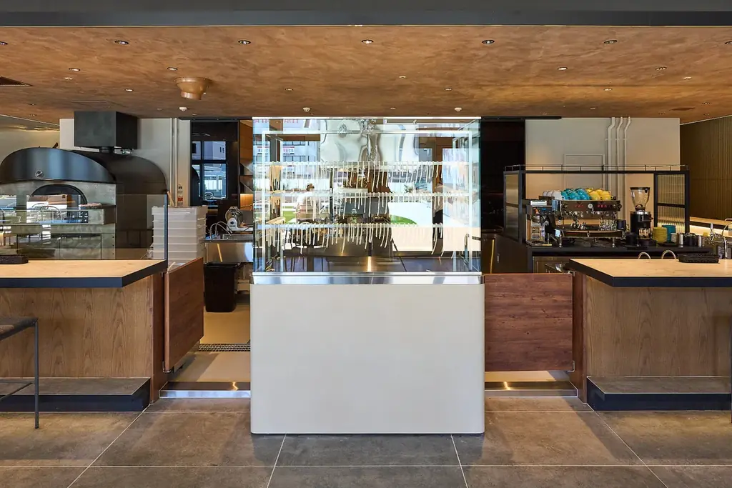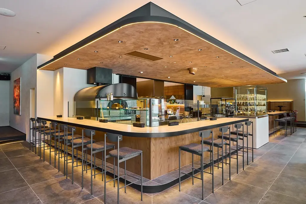 ピザ窯を囲むライブカウンターでは、職人が目の前で生地を伸ばし焼き上げる様子を見られ、香ばしさや湯気、膨らみの瞬間を五感で体感できる仕様です。