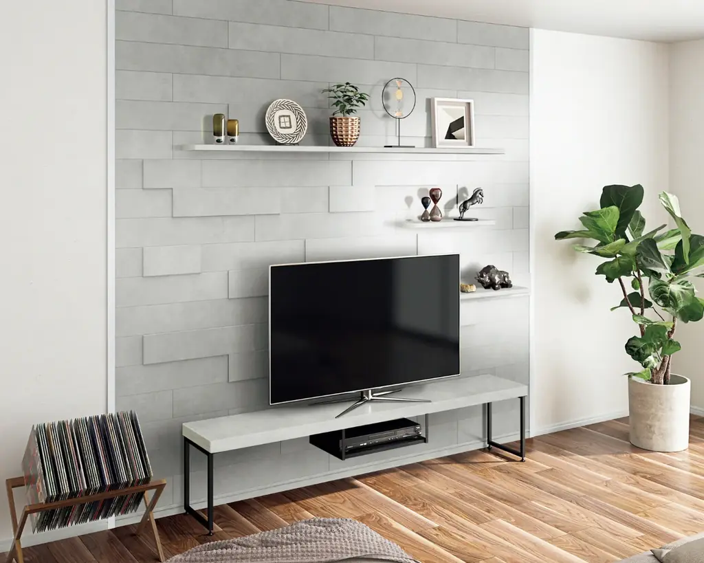 厚みの異なる高意匠の小割壁材を組み合わせたウォールデコや、シェルフデコといった、物を飾ることでショップのような空間演出が可能な製品にも異素材柄が登場します。