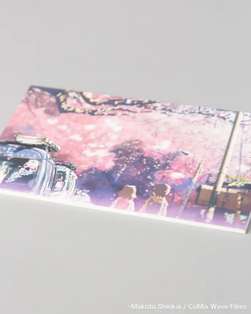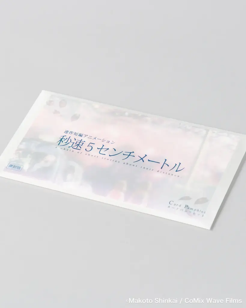公開当時に劇場で人気を博し再販の声が高かったカード型パンフレットを復刻した一冊です。封筒に収められたカード形式で、まるで登場人物の文通を思わせる仕様になっています。新海誠監督のインタビュー、キャスト・スタッフコメント、各話(「桜花抄」「コスモナウト」「秒速5センチメートル」)のプロダクションノートなど、当時の貴重なコンテンツが収められています。