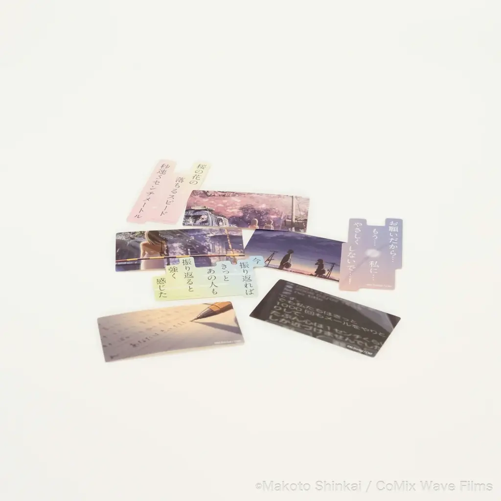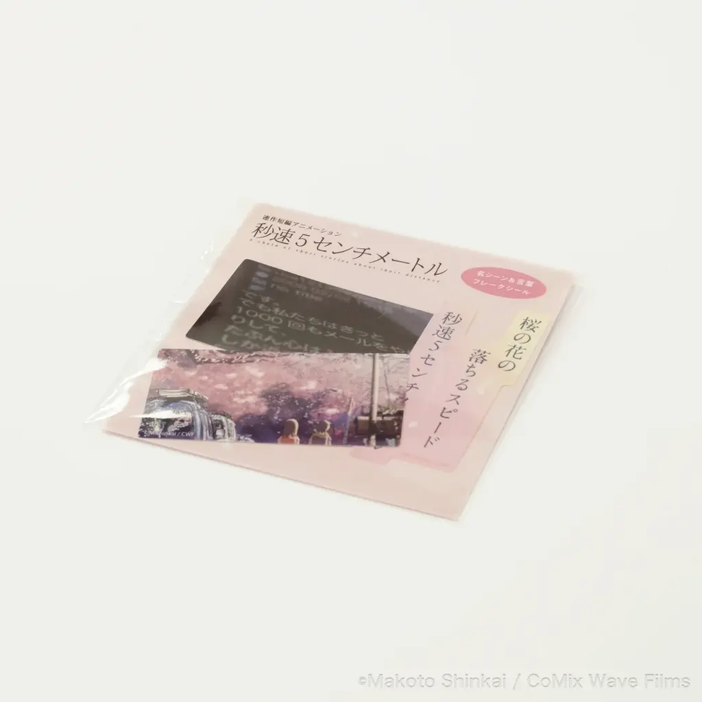 作品内で登場人物が交わした「言葉」と、印象的な名シーンをフレークシールとして商品化したものです。「桜花抄」「コスモナウト」「秒速5センチメートル」各話からの記憶に残るシーンを選定し、手紙やメールなどのやりとりの場面もフレークシールに収録しています。