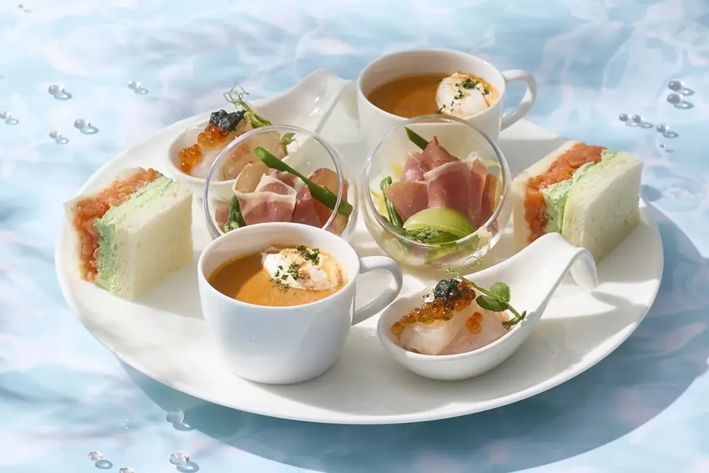 セイボリーは4種で、ハーブや海の旨味を生かしたメニューが並びます。甘いスイーツとのバランスを考えた塩味の構成です。