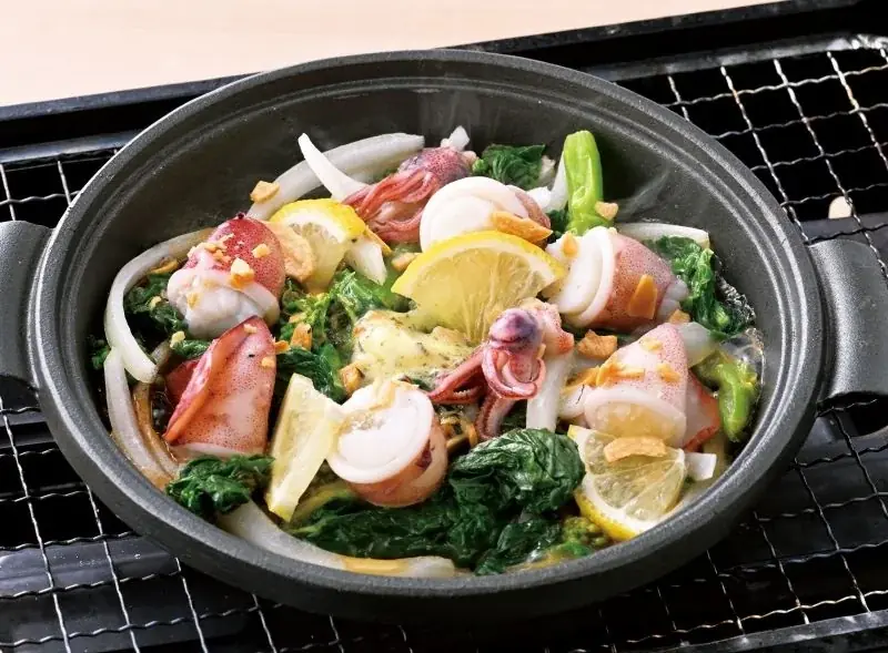 春小イカと菜の花をガーリックバターで焼き上げる陶板焼です。見た目にも春らしく、菜の花の程よい苦みと小イカの甘みがガーリックバターで引き立てられます。
