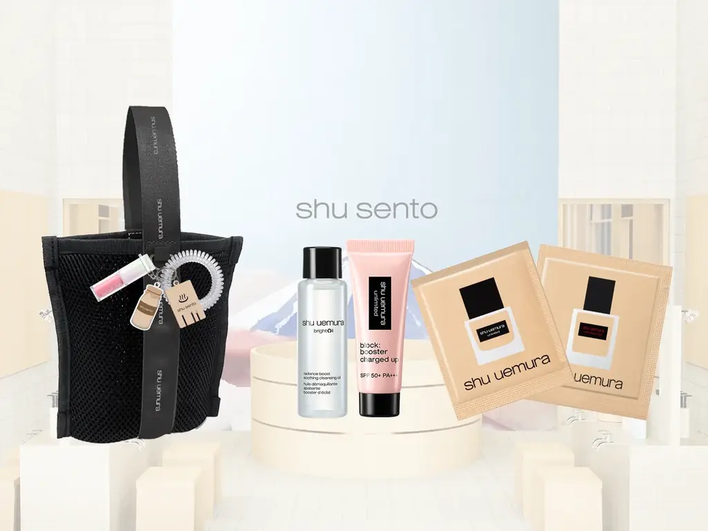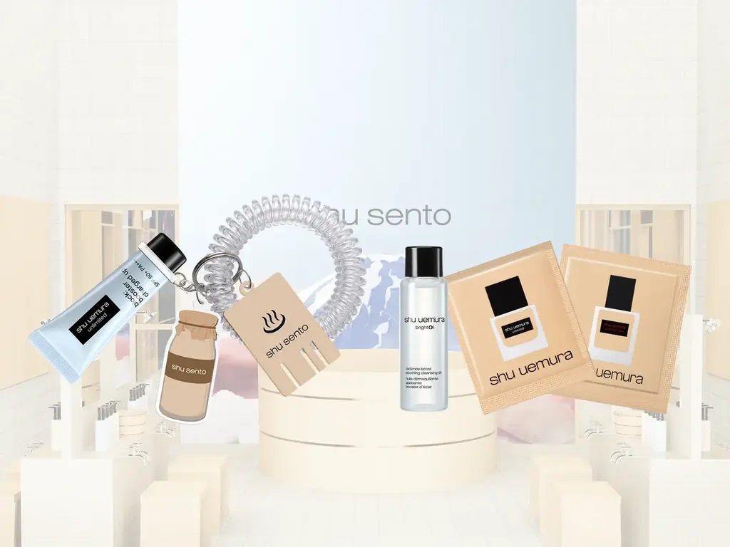 - 税込10,000円以上の購入で「shu sento 湯めぐりセット」をプレゼント(上記チャームセットに加えてオリジナルミニ湯めぐりバッグを付与)。