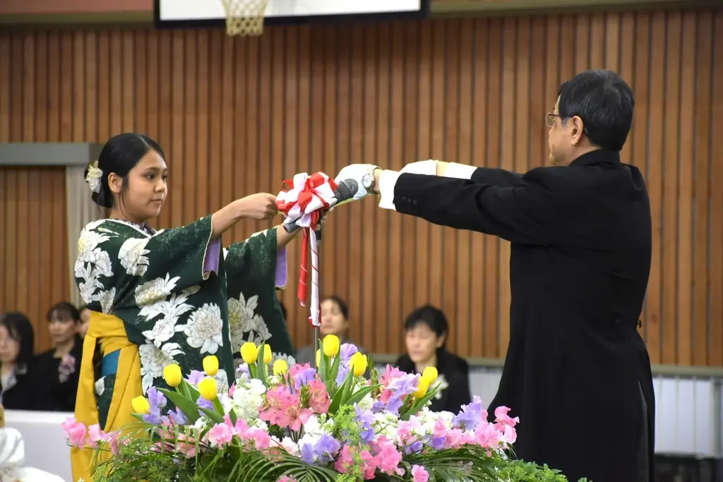 式辞の一節は次の通りです。校長は「この学校で学んだことすべてが、皆さんの人生を豊かにする大きな力になると思います。さらには、人々に感動を与え、幸福にするものでもあります。ぜひ、自信と誇りを持ってこの学校を巣立ってください。これからは、社会との関わりの中や、家庭の中でその力を発揮し、人生をより充実した豊かなものにしていってください。職員一同、皆さんの新たな世界での活躍を期待しています」と述べました。
