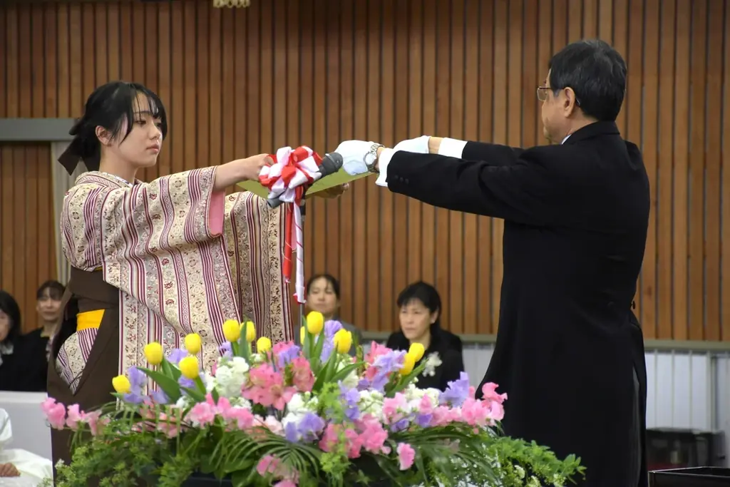 入場時の様子は落ち着いた雰囲気で進行し、卒業生たちは凛とした表情で式に臨みました。卒業証書は宮林秀和校長から一人ひとりに手渡され、受け取る姿には達成感が感じられました。