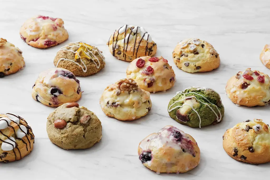 もう一つの主力商品はハワイアンスコーンです。イングリッシュスコーンの形状とは異なり、クリームチーズをたっぷり練り込んだ生地にフルーツ等の具材を混ぜ込むハワイで人気のスタイルで、外はサクッと中はしっとりとした食感が特徴です。