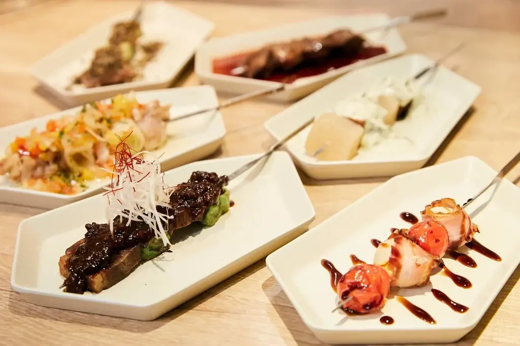 - 串焼き例:牛タンとだいこん(わさびクリームソース、572円)、つくね(ブルーチーズソース、572円)、えびのカダイフ焼き(418円) 全8種類