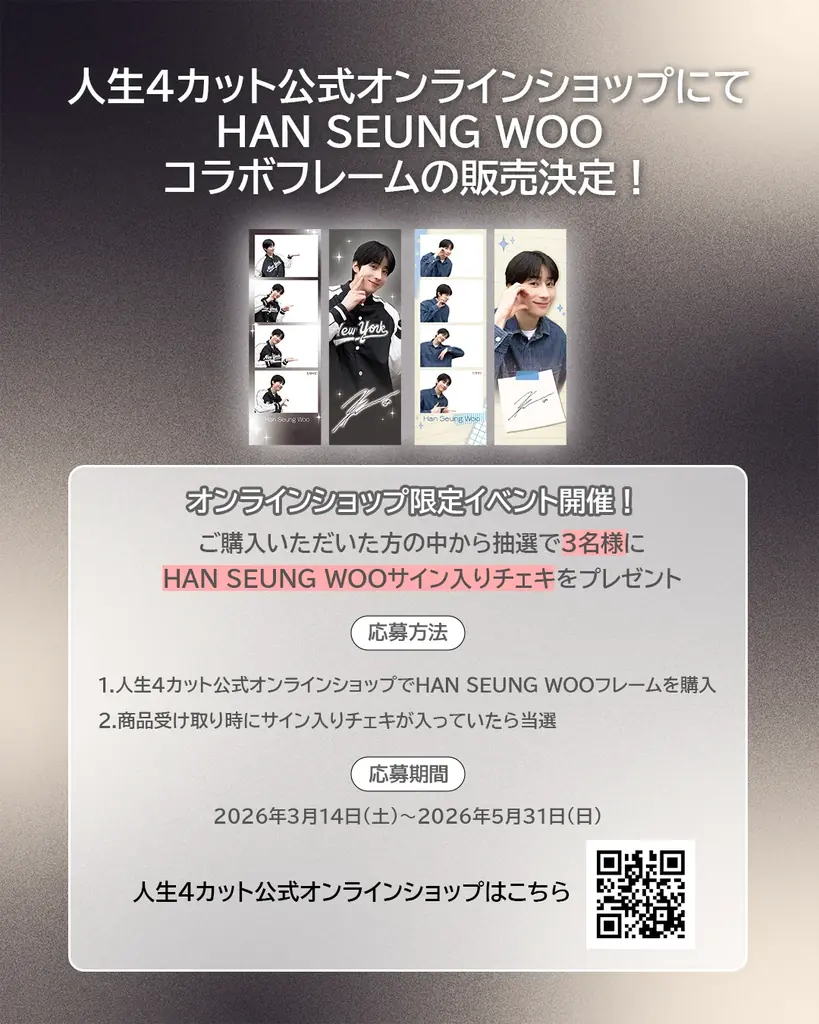 Qoo10の人生4カット公式オンラインショップでコラボフレームを購入した方も抽選の対象となります。オンライン購入者の中から抽選で3名に、HAN SEUNG WOO直筆サイン入りチェキがプレゼントされます。