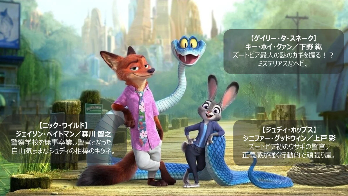 物語は、動物たちが人間のように暮らす都市“ズートピア”を舞台に、前作に続いて警察官としてバディを組むウサギのジュディとキツネのニックが主人公です。100年ぶりに街に現れたヘビの存在を契機に、ズートピア誕生に隠された驚くべき秘密と真実を解き明かしていくというストーリーラインが採られています。