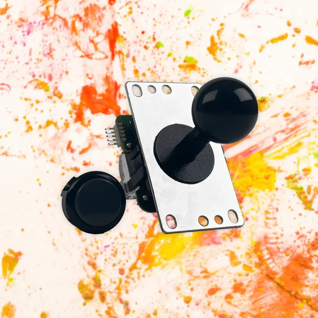 ジョイスティックレバーと押しボタンは長年実績のある三和電子製を採用。レバーは三和電子 JLF-TP-8YT-SK、ボタンはOBSF-30(30mm)およびOBSF-24(24mm)で、アーケードに近い操作感を目指した構成です。