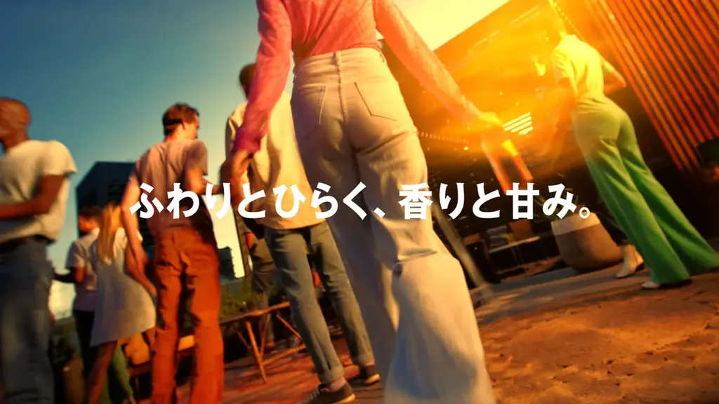 映像は夕方、ビルのテラスで複数の男女が談笑するカジュアルな場面から始まり、「ブロンド」を片手にグラスを重ねることで「ふわりとひらく、香りと甘み」を共有する様子を描写します。メッセージとして「楽しいことは、自分でつくる。」を掲げ、視聴者が自分に立ち返る瞬間を表現しています。